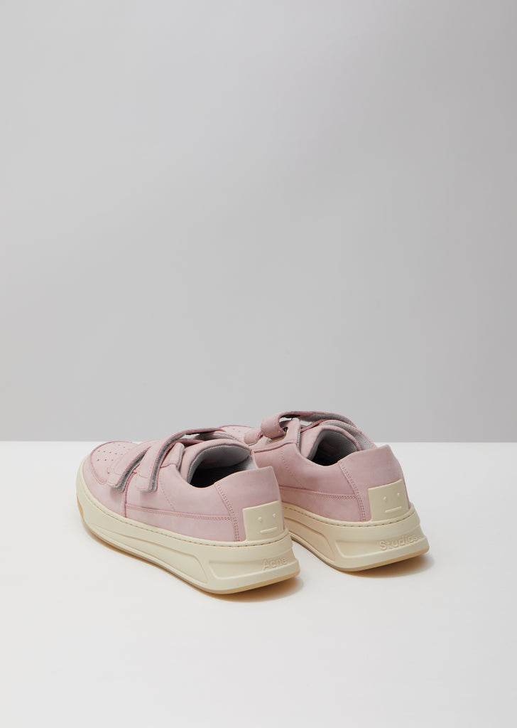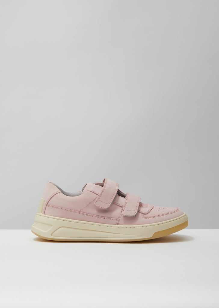 Acne Studios Steffey Nubuk Sneakers in lilac and white. Signature ow-top sneakers with a textured nubuck upper and double Velcro straps. This athletic slip-on style is finished with the brand’s signature embossed rubber Face patch at the heel counter.