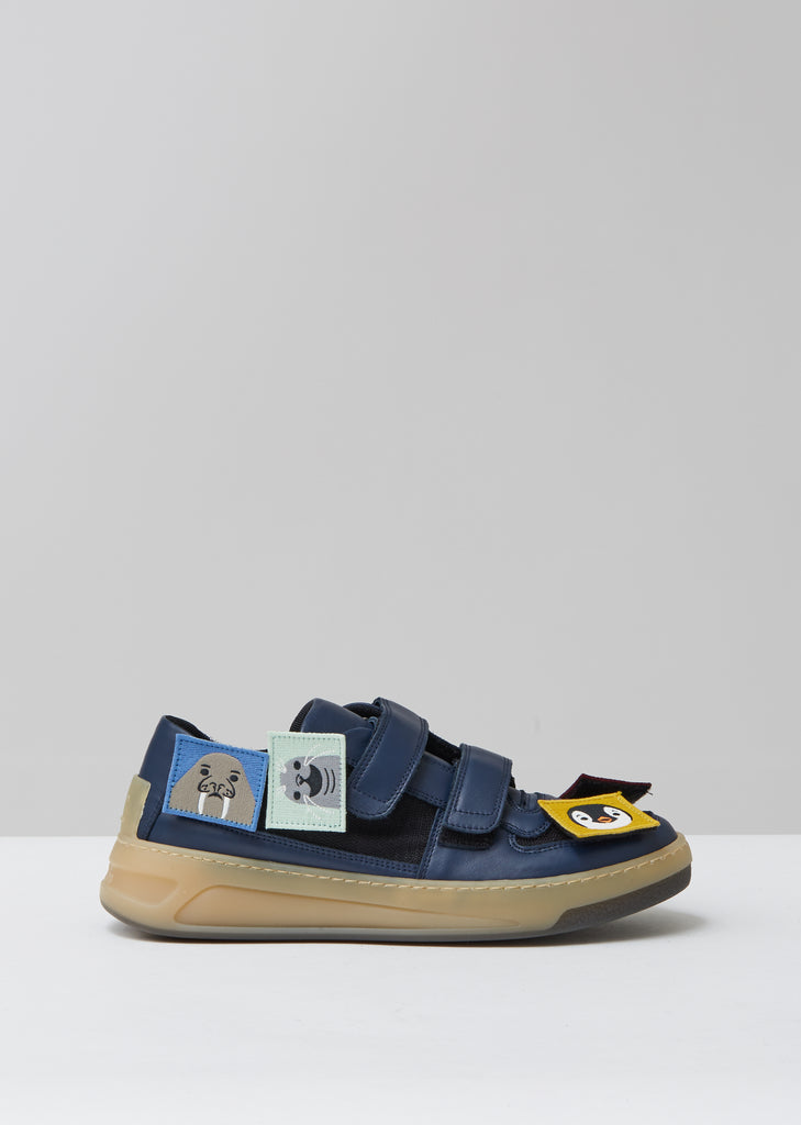 Navy nubuck-leather low-stop sneaker accessorized with interchangeable multicolored patches depicting marine animals and the brand's "Face" logo, which attach to the sneaker's Velcro-hook vamp and quarter panels. Flat profile. Round toe. Two Velcro grip straps at throat. Polished silver-tone metal eyelets. Padded tongue. Beige rubberized "Face" logo tab at heel counter. Thick beige rubberized midsole. Dark-taupe rubberized outsole. Fabric insole. Black mesh lining.