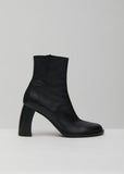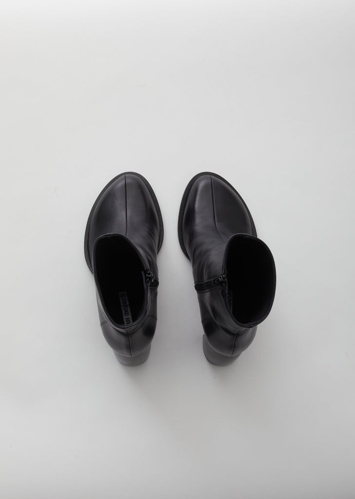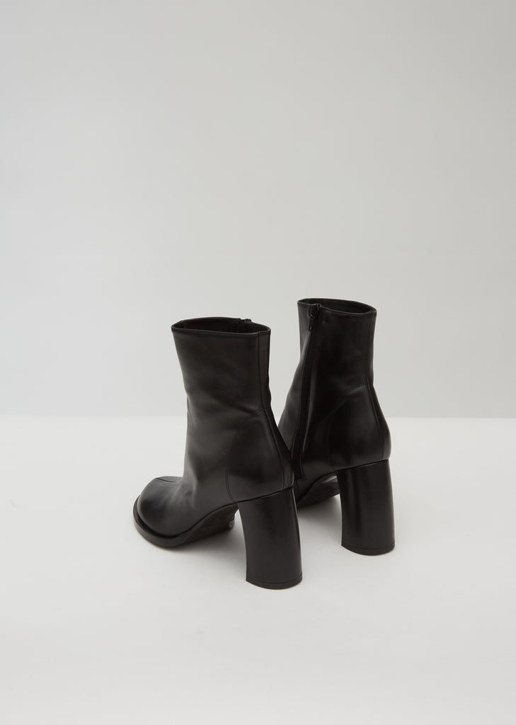 Black laceless calf boots in semi-lustrous Vitello calf leather, designed with the label’s signature “banana” convex block heels.