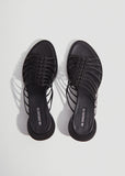 Ann Demeulemeester’s Braided Heeled Slides in black. Crafted in calfskin leather, these unique sandals feature woven straps at upper with a signature statement stacked heel.