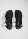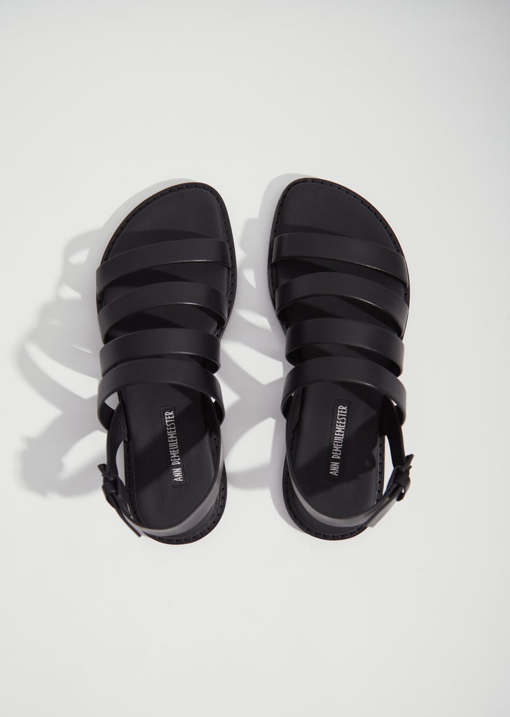 Ann Demeulemeester Leather Slingback Sandals in black. Crafted in smooth leather, these sandals feature multiple cross straps at upper with an adjustable back strap with black buckle on a flat stacked heel. Part of the Permanent Shoes Collection from the Antwerp-based label.