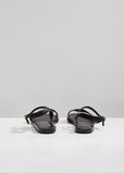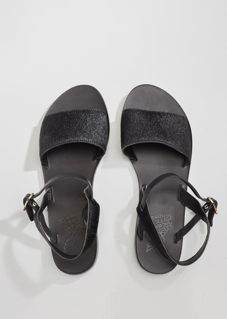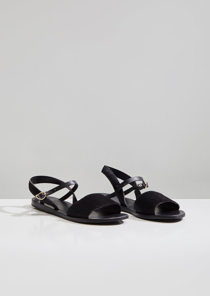 Classic Kaliroi sandals in naturally tanned black leather. Handcrafted in Greece, this artisanal pair showcases two interlocking straps over the heel and ankle, for a simple, effortless look. The Kaliroi is set on a supportive heel, with a leather midsole and durable rubber sole. Detailed with the label's signature wing gold-tone buckle. Color: Black. 99% cow leather, 1% rubber. Handmade in Greece.