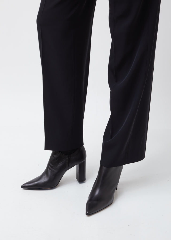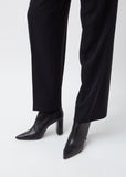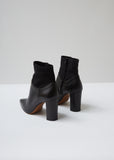 Black Nappa-leather ankle boot designed with a self-covered block heel and a tonal stretch-fabric shaft. Handmade in Italy using vegetable-dyed leathers, ATP Atelier shoes develop a worn-in (but no less durable) character with age. Pull-on style. Pointed toe. 8.5 centimeter block heel. Leather sole.