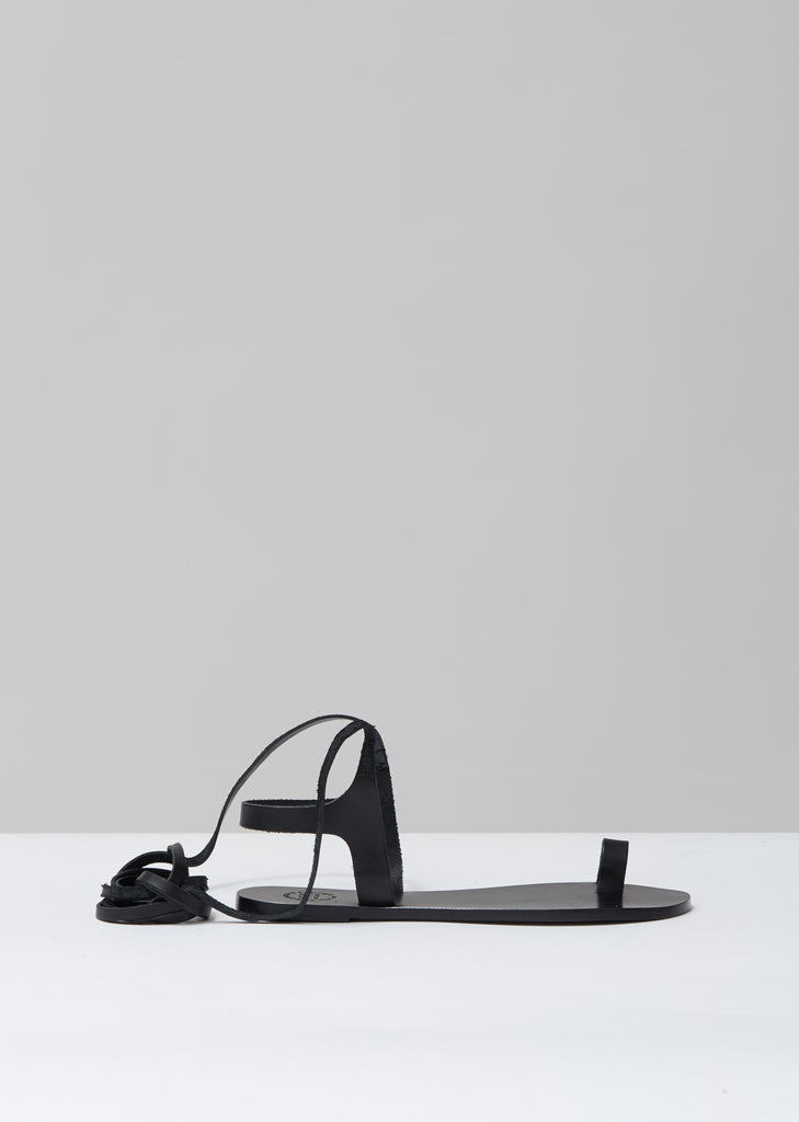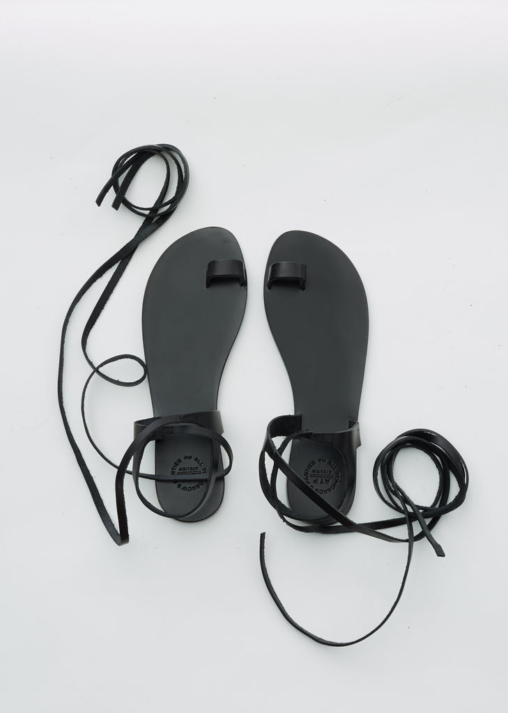 Black wrap around sandals in calf leather. Long straps tie up and around the leg. Front toe strap meets the sole between the first and second toe. Durable Leather soles. This shoe will feel tight at first but will mold to the foot with regular wear. Every pair is unique and slight variations in color may appear. Also available in Ice White.