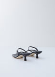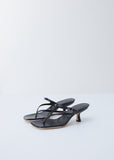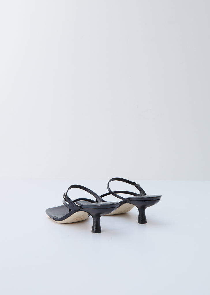 By Far Desiree Sandals in Black. Thong heeled sandal with cross strap and mini buckle finish on a sculpted leather covered heel.