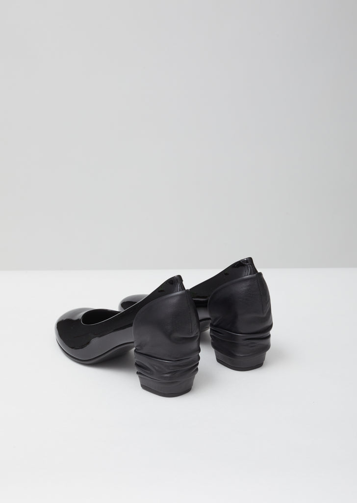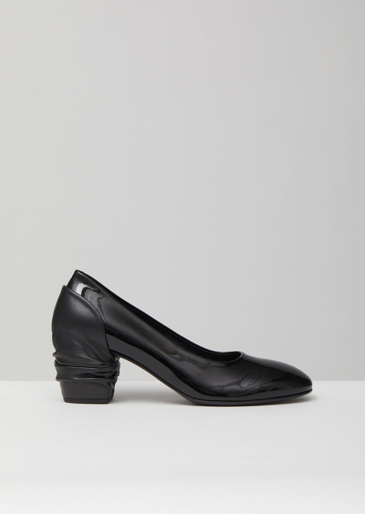 Comme des Garçons Patent Leather Heels in black. From the runway collection, these classic pumps with a retro look features a block heel wrapped in tonal ruched grained leather.