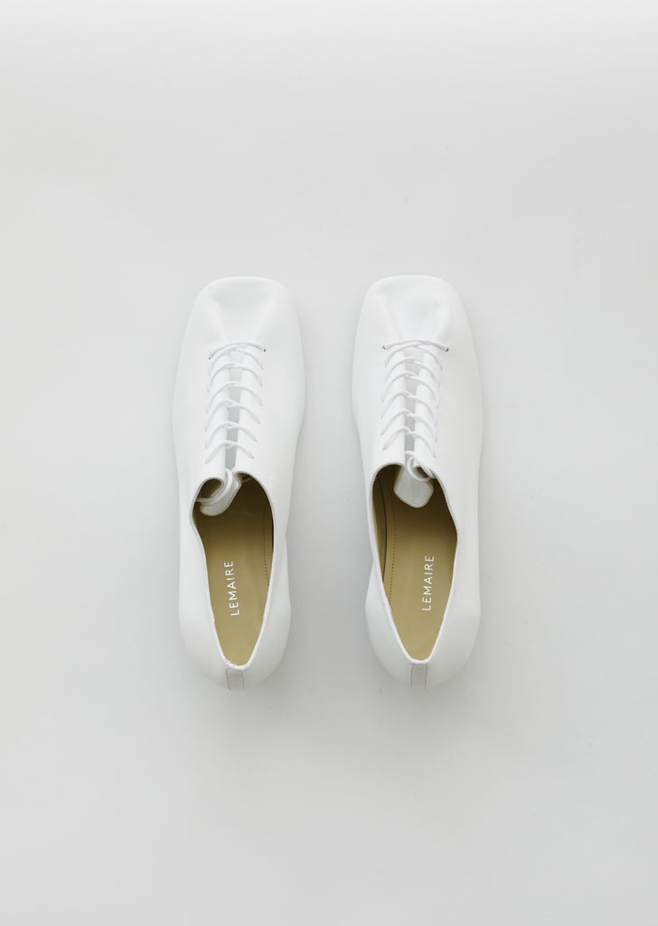 Square-toe stack-heel derby in white Nappa lambskin, inspired by ballet-slipper silhouettes. Lace-up vamp. Tonal waxed-cotton laces. Non-reinforced eyelets. Chocolate leather midsole. Brown stacked wooden heel. Medium-beige leather insole with silver-stamped logo. Medium-beige leather lining.