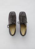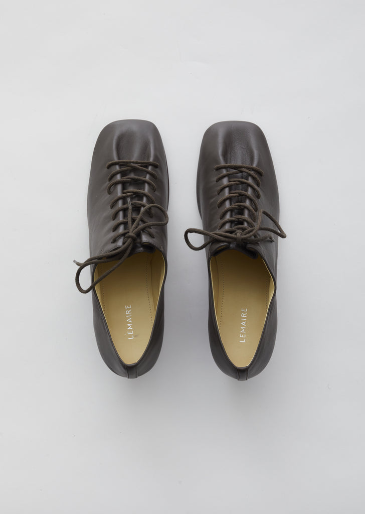 Lemaire Heeled Derbies in Anthracite. Crafted in supple Nappa leather, these dark grey signature lace-up heels feature soft pleating at the vamp and tonal waxed-cotton laces.