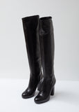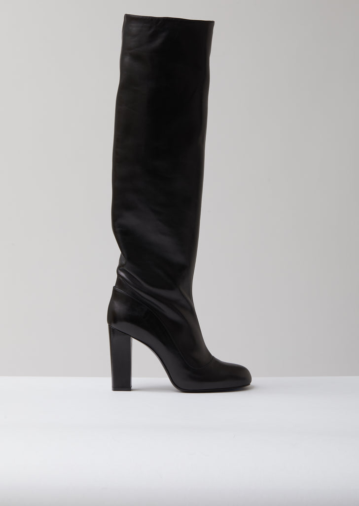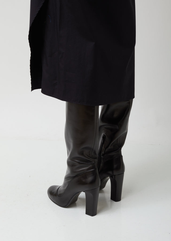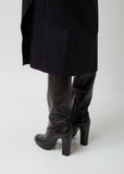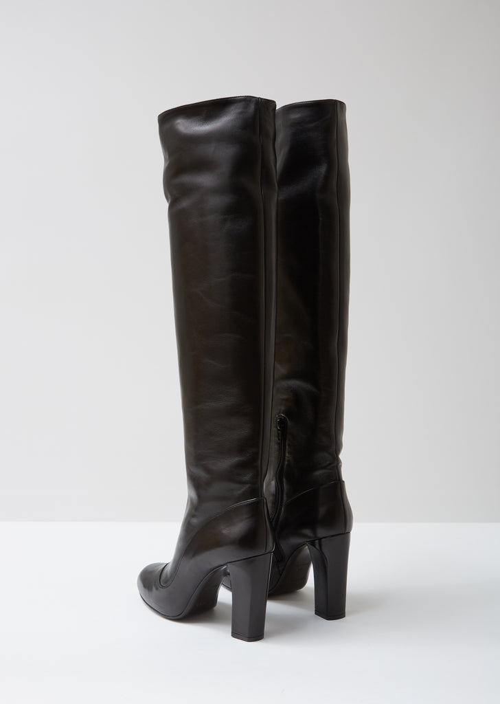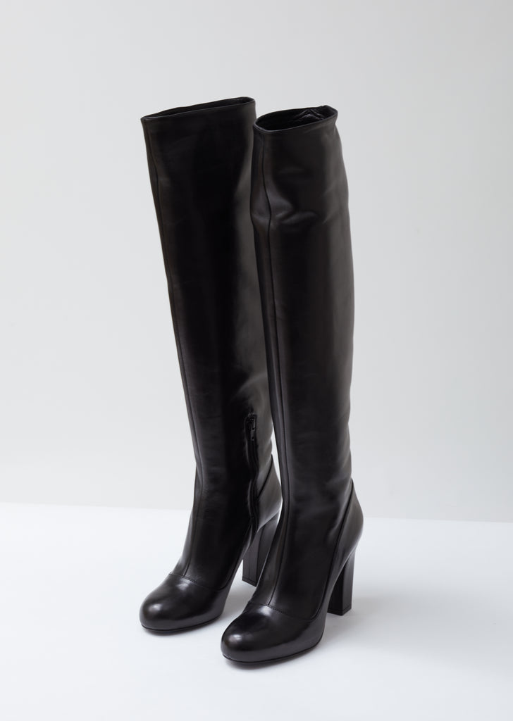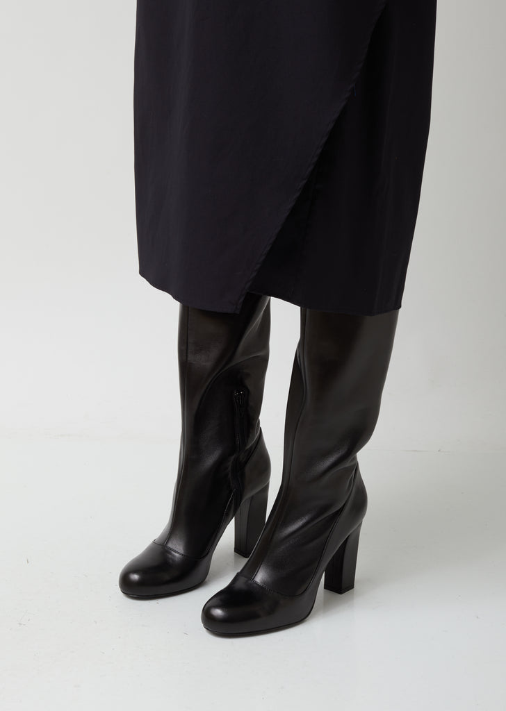 High-heeled knee boot crafted from supple black calfskin, featuring a paneled construction and a rounded apron toe. Exposed tonal half-zip side closure. Self-covered tapered block heel. Tonal rubberized heel cap. Leather sole and lining.