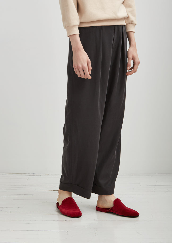 An iconic footwear brand in Paris from the ‘50s through the ‘70s, Carvil, now under the direction of veteran accessories designer Frank Charriaut, is reinventing itself by bridging tradition with modernity—and is exclusive to La Garçonne this season. This simple open-back slipper is rendered in an Italian velvet sourced personally by the designer. Also available in Navy & Black.