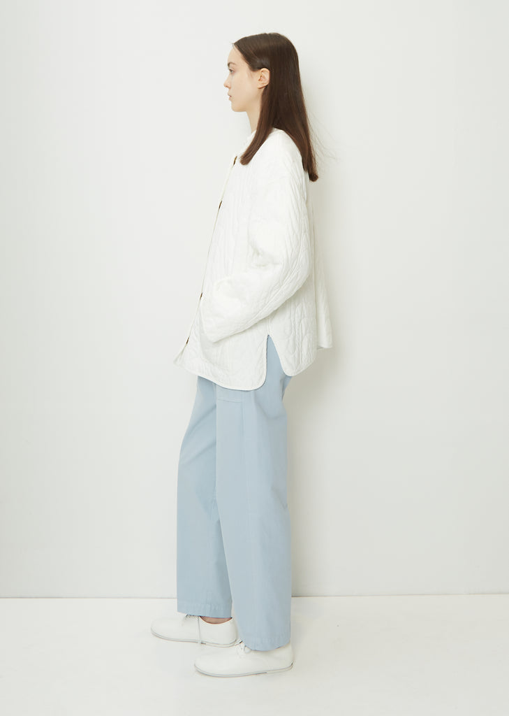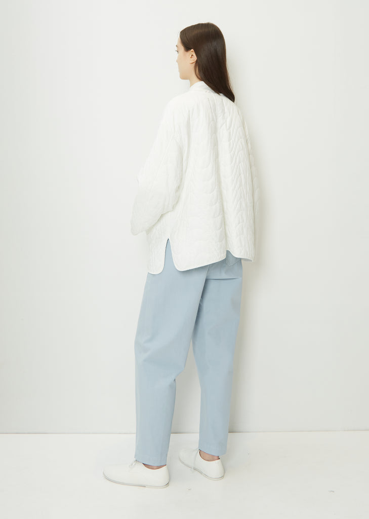 Forte Forte pure white reversible lightly padded bomber in viscose. Features a wavy stitch pattern, two hip patch pockets, and snap front closure. Side slit detail. Slightly oversized fit.