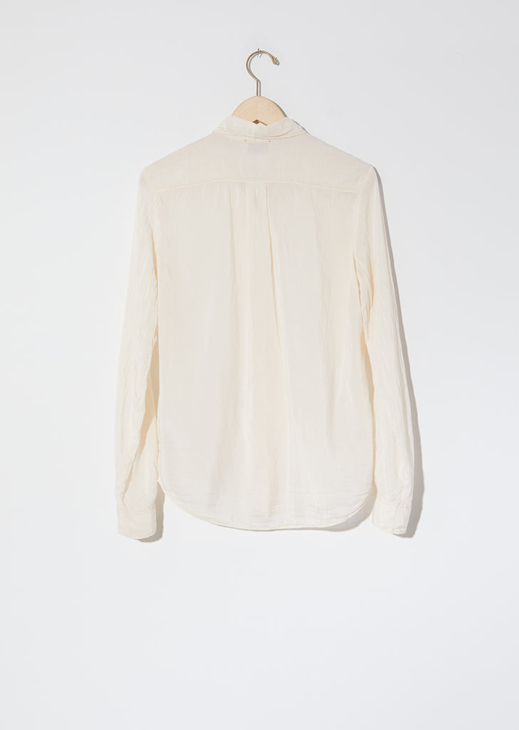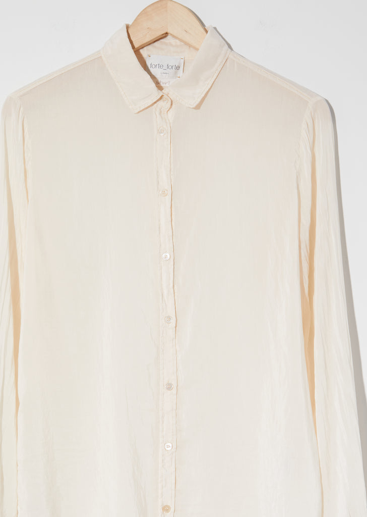 Forte Forte Voile Shirt in Cream. Signature button down shirt in a lightweight cotton and silk voile with a soft collar and finished with shell buttons down front and at cuffs.
