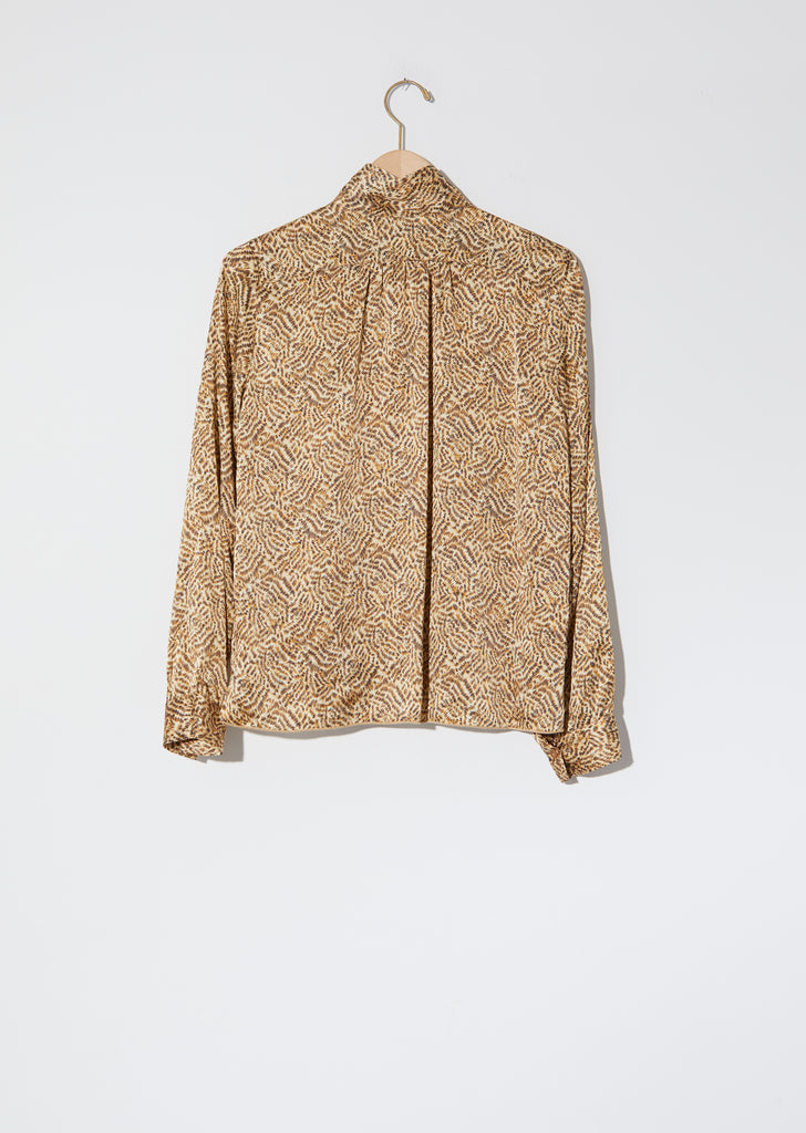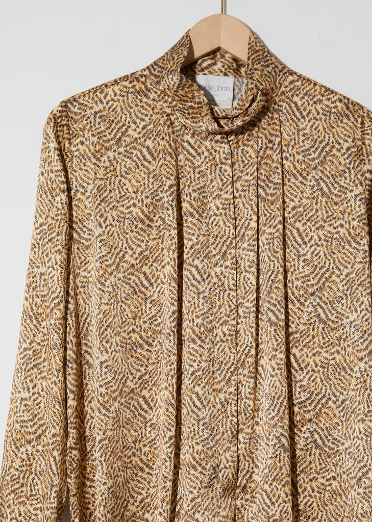 Forte Forte Eagle Print Satin Silk Shirt. Camel and brown printed silk blouse with a hidden button placket and softly draped high neck. Soft pleats at center front.