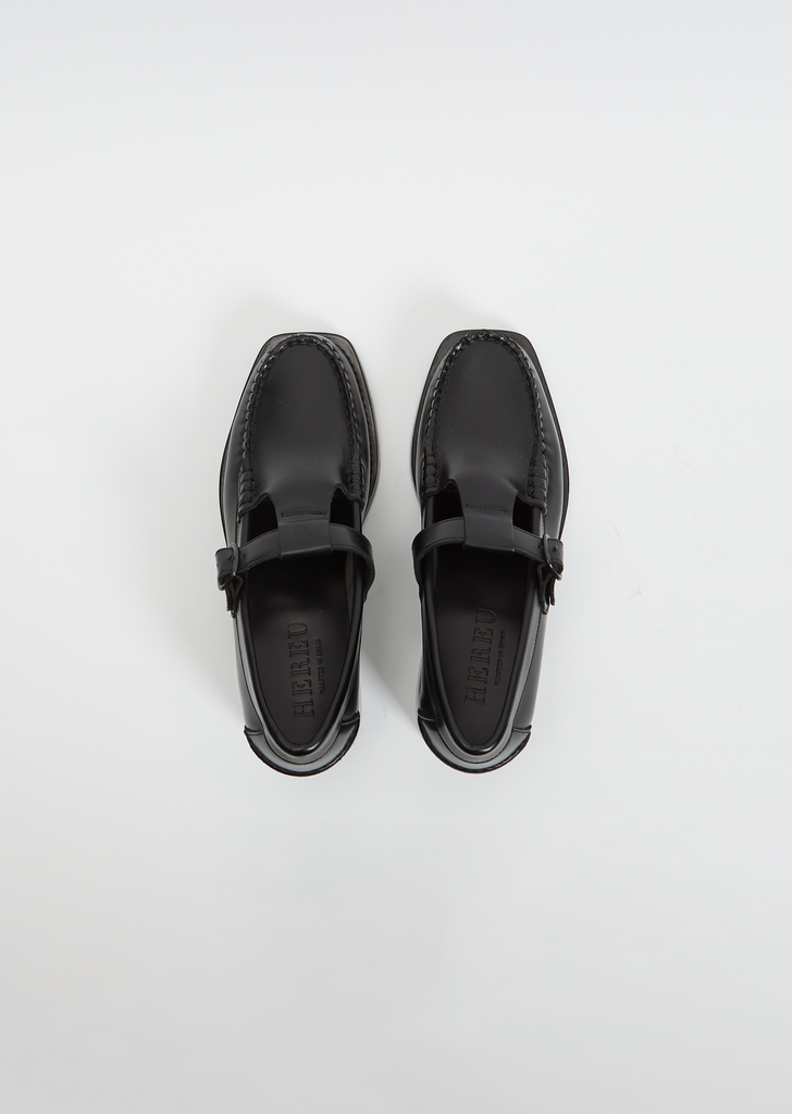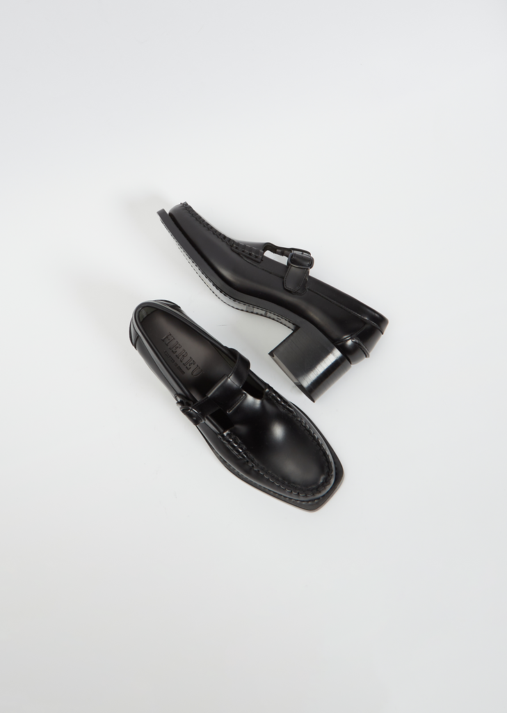 Hereu black square toe heeled t-bar loafer with hand-sewn detail, crafted in Spanish full-grain calf leather.