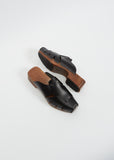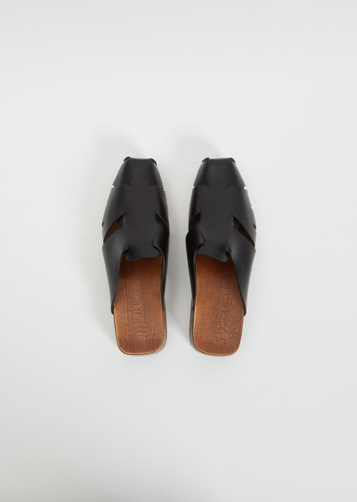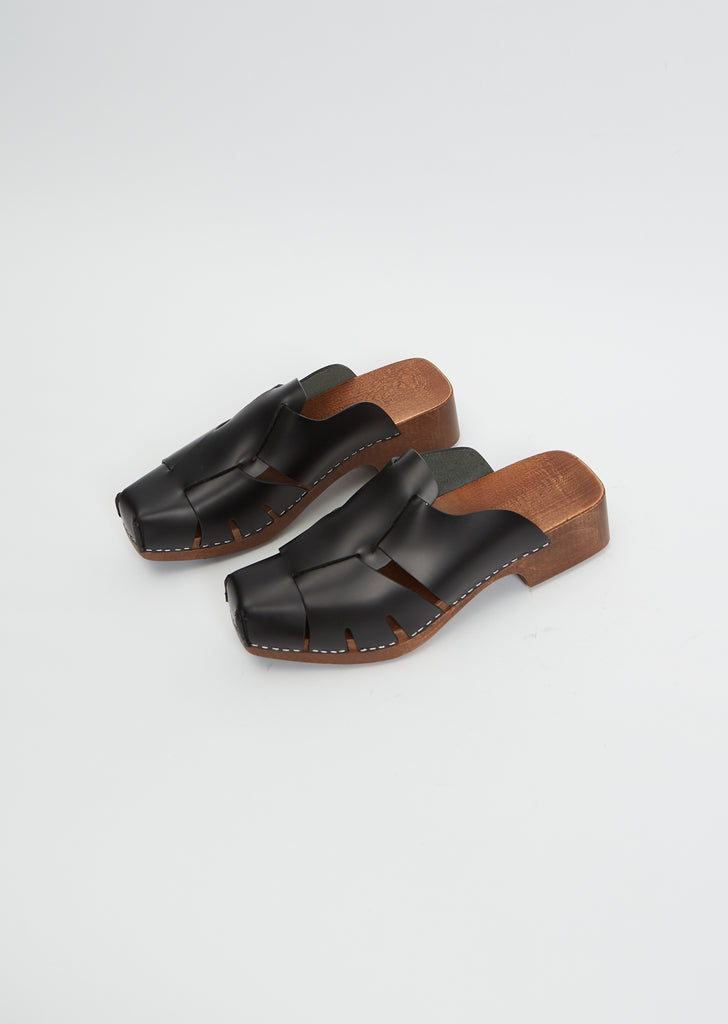 Hereu black square toe wooden mule clog with fisherman-sandal details, crafted in Spanish full-grain leather.