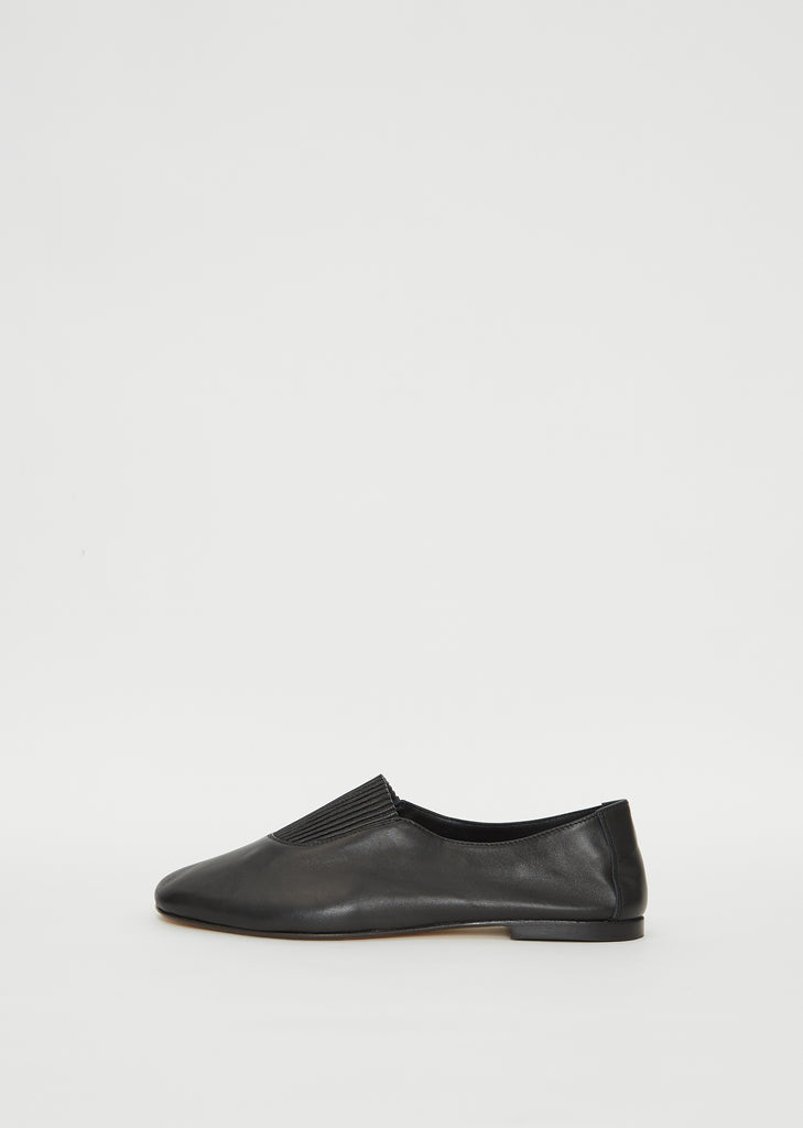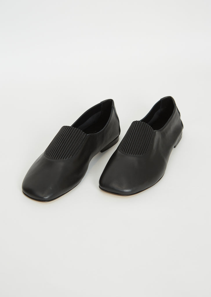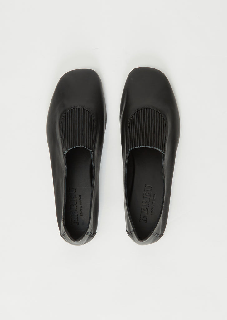 Hereu black slip-on flats with pleated vamp detail and squared toe, crafted in supple lambskin leather and lined in lambskin leather.