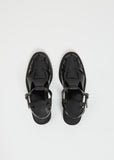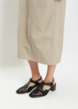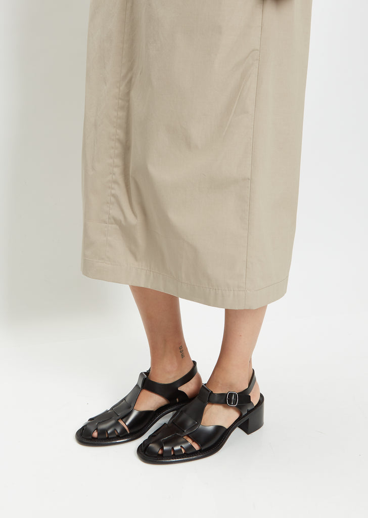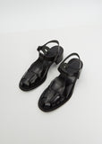 Hereu black heeled t-bar sandal with an ankle strap, handcrafted in Spanish full-grain leather.