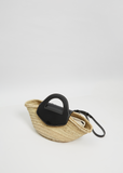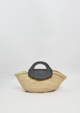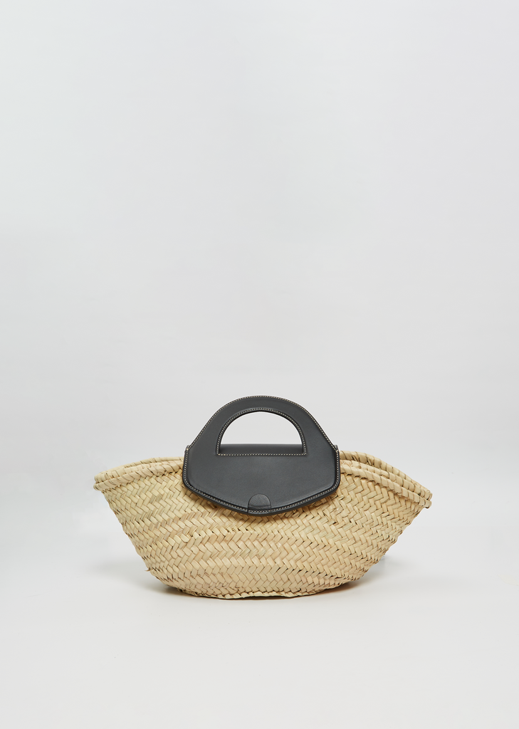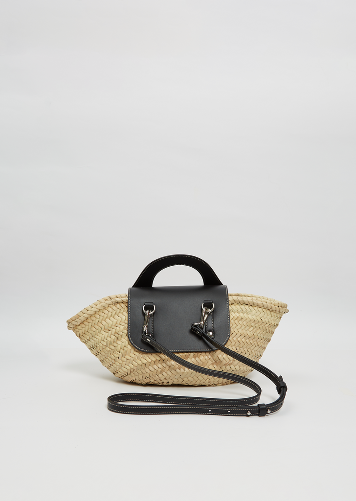 Hereu beige and black handwoven straw basket handle bag with cutout leather flap crafted in smooth calf leather.