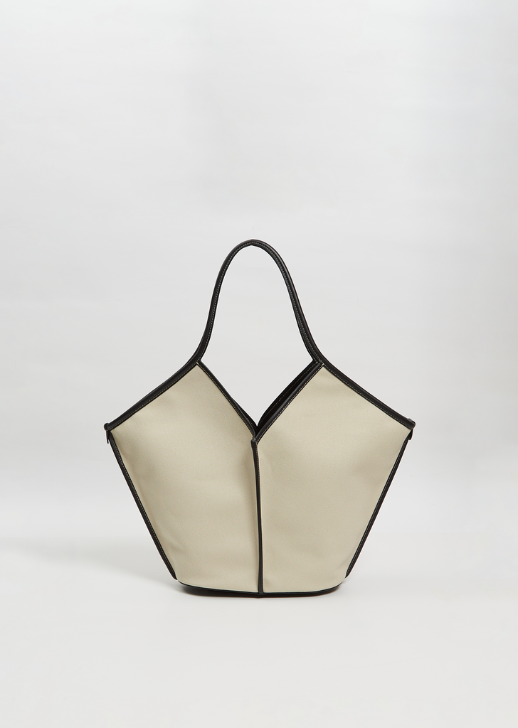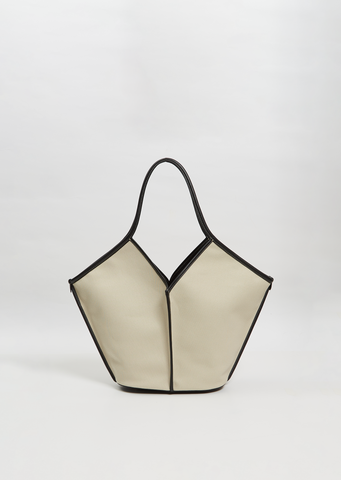 Hereu beige v-shaped tote bag in an organic cotton canvas edged with black smooth leather.