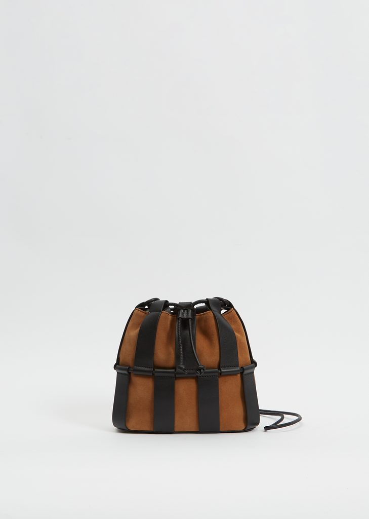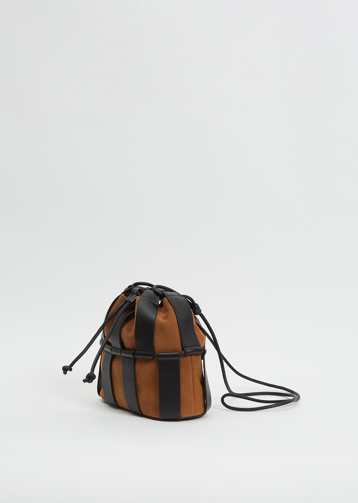 Hereu two-toned tan and black drawstring crossbody bag crafted in suede and paneled with smooth calf leather strips, and lined with organic cotton canvas.