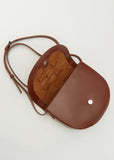 Hereu chestnut half moon satchel bag with woven front, crafted in full grain leather.
