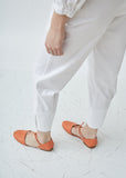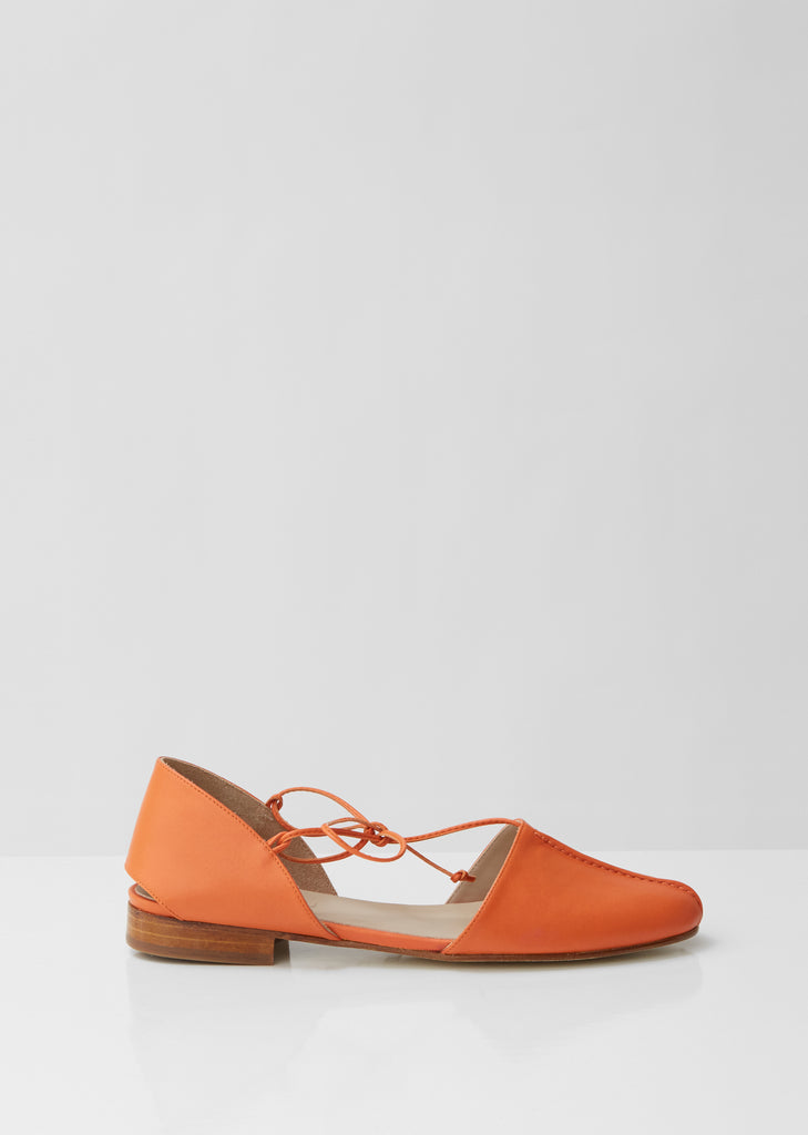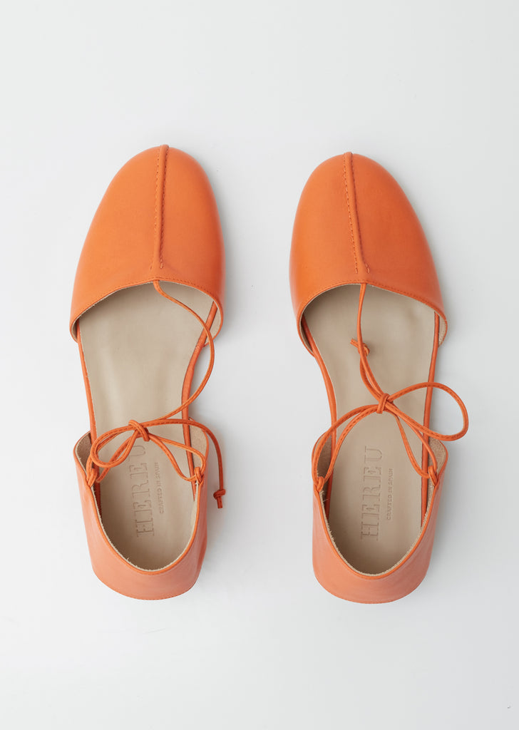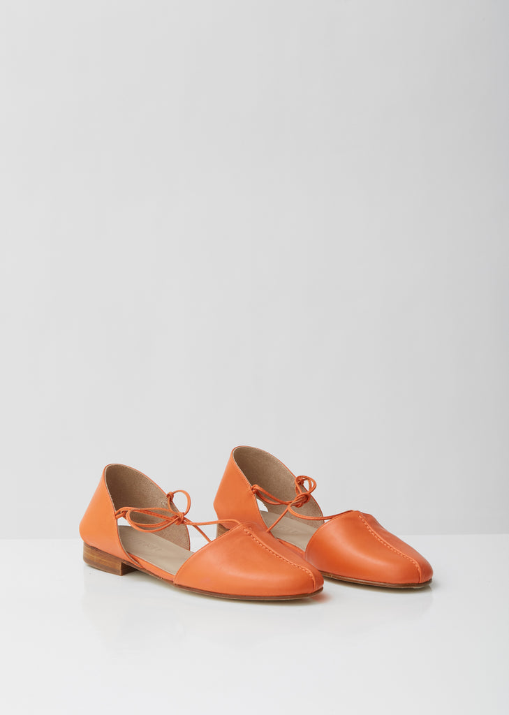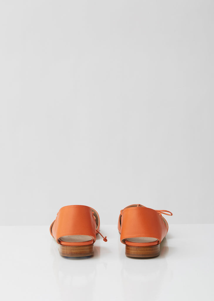 Handmade sling back sandal crafted of soft orange calf leather. This sandal features a closed rounded toe and elegant t-bar knotted fastening. Thick sling back strap. Low stacked heel. Leather lining. Color: Orange. 100% Calf Leather. Made in Spain.