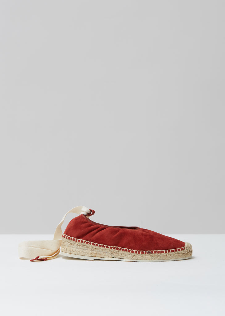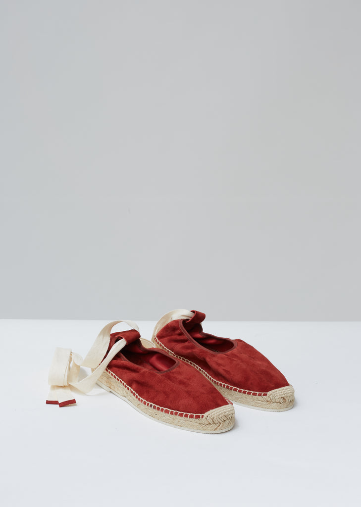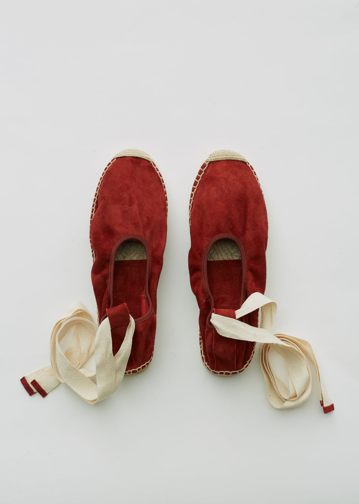 Dark terracotta traditional shoes with jute soles stitched by hand to Spanish calf-leather upper. Unlined soft calf leather. Elasticated top line. Removable cotton ankle ties with leather tips. The heel is a little more than an inch tall. Made in Spain. Also available in Black Suede. Color: Teja Suede. 100% suede. Imported.