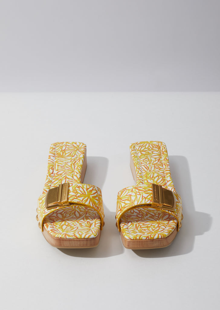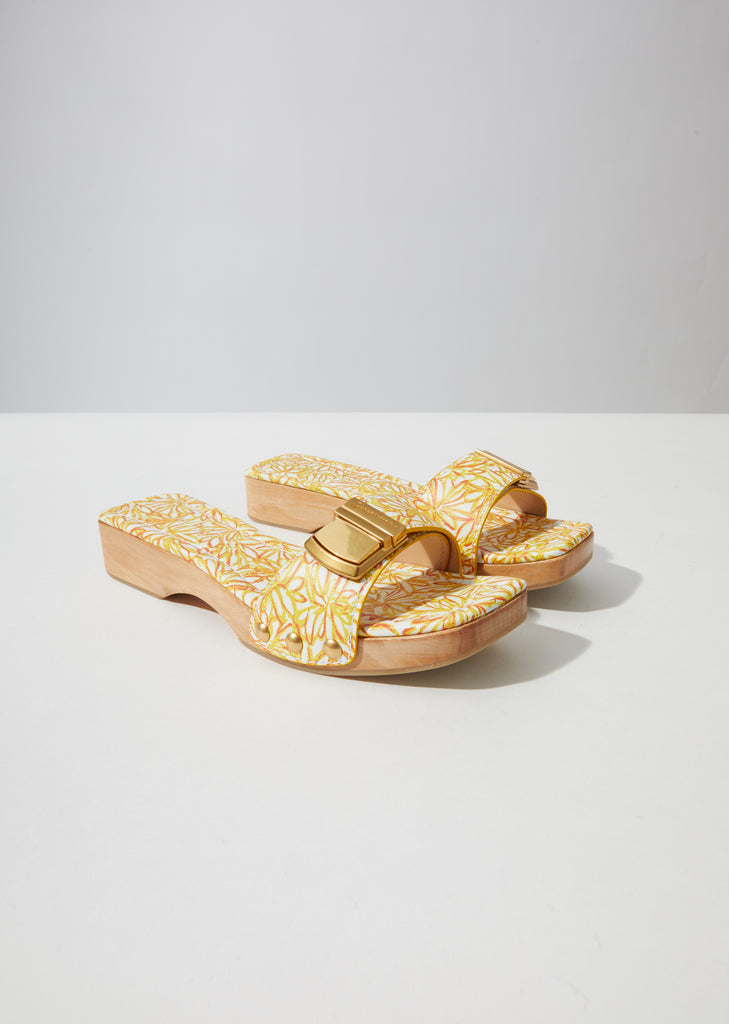 Orange, red, and white flat slide sandals crafted of Nappa leather in a scribbled floral print, featuring an arched wooden sole and buckled vamp straps.
