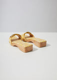 • square open toe; engraved designer signature at antiqued-brass center-release buckle; antiqued-brass studs at vamp straps; logo-debossed self-leather footbed