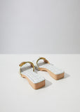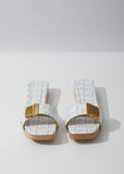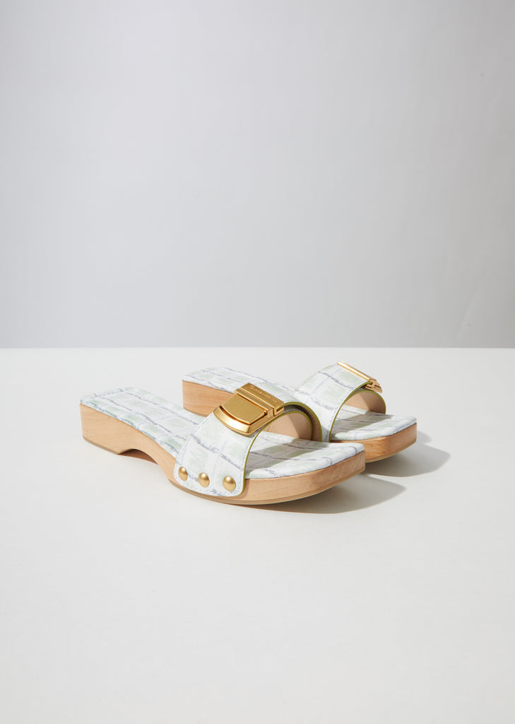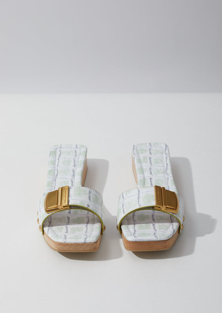 Green, blue, and white flat slide sandals crafted of Nappa leather in a crayon-drawn check print, featuring an arched wooden sole and buckled vamp straps.