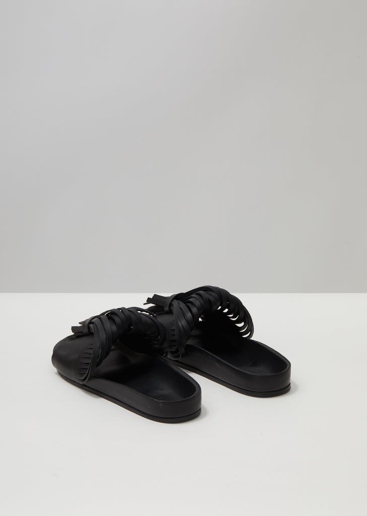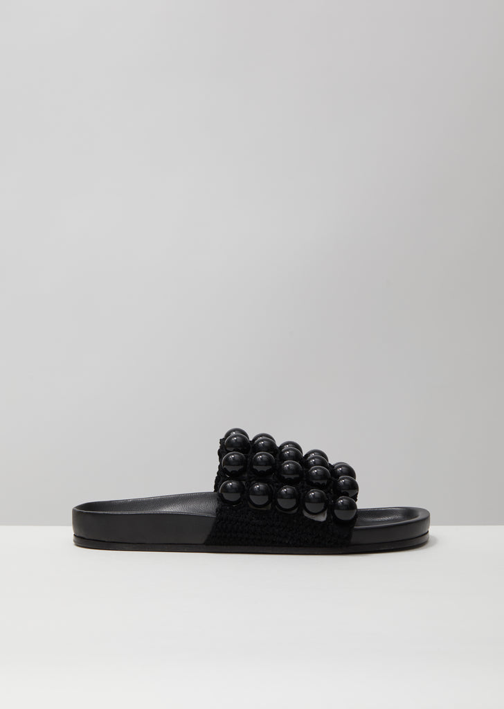Black slide sandals crafted of buffed leather, featuring open-grid-knit vamp straps strewn with tonal resin beads.