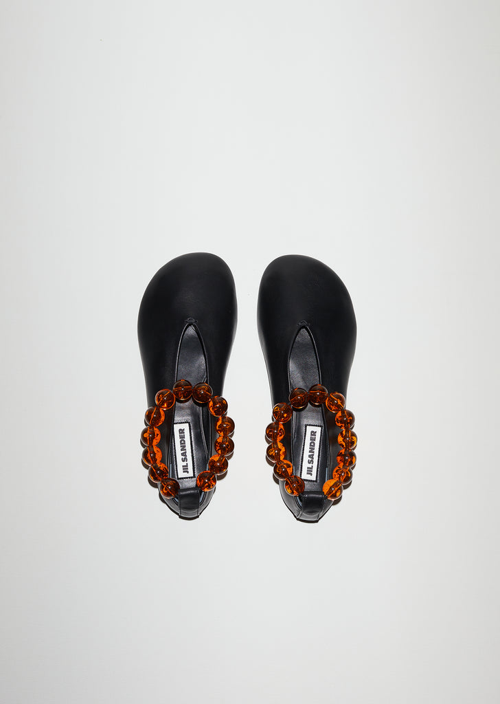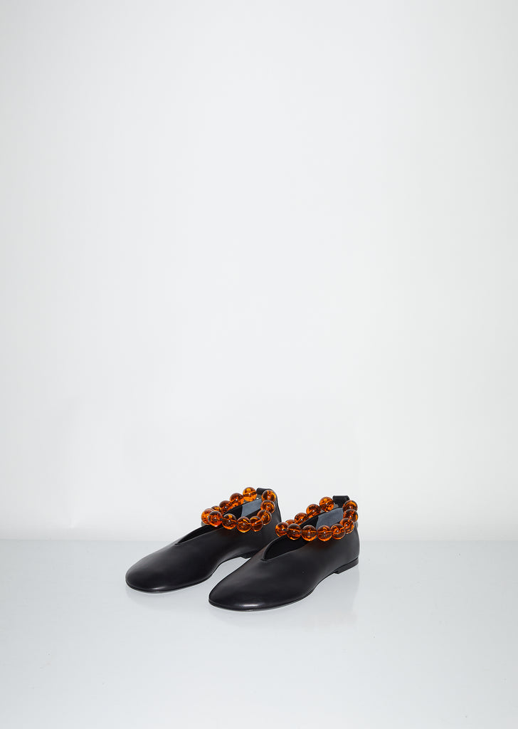 Black round toe ballerina flat in supple Nappa leather, adorned with an elastic anklet strung with spherical amber-tone resin beads.