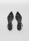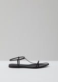 Black calfskin sandal with a T-shaped ankle strap that extends to the tip of the pointed toe. Toe strap. Ankle strap pin-buckles at side. Silver-tone metal hardware. Tonal leather sole and flat stack heel. Debossed logo at footbed.