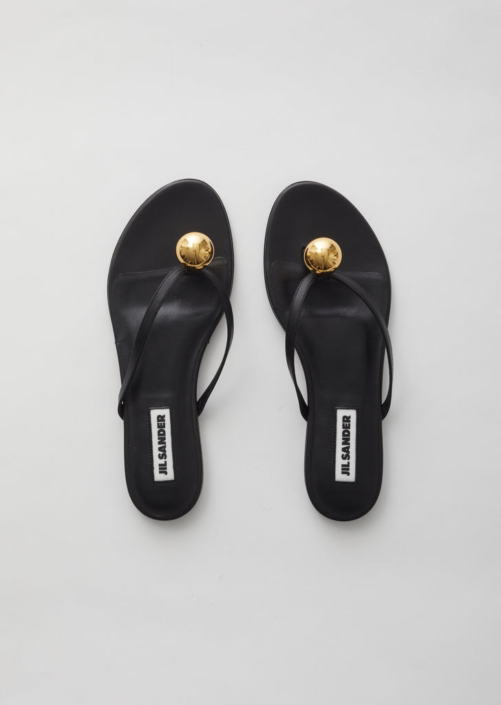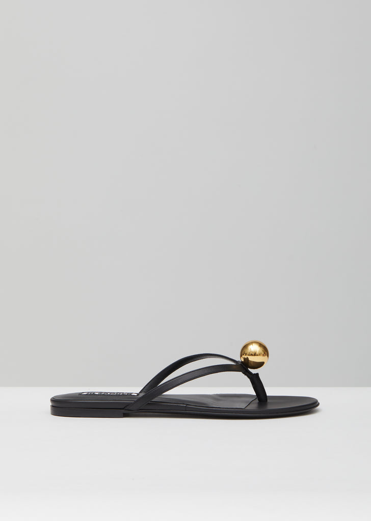 Flat black thong sandal in grained Nappa leather, hand-finished with a gold-tone metal sphere ornament above the toe post.