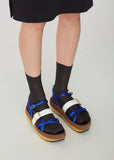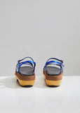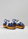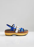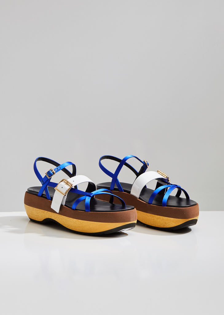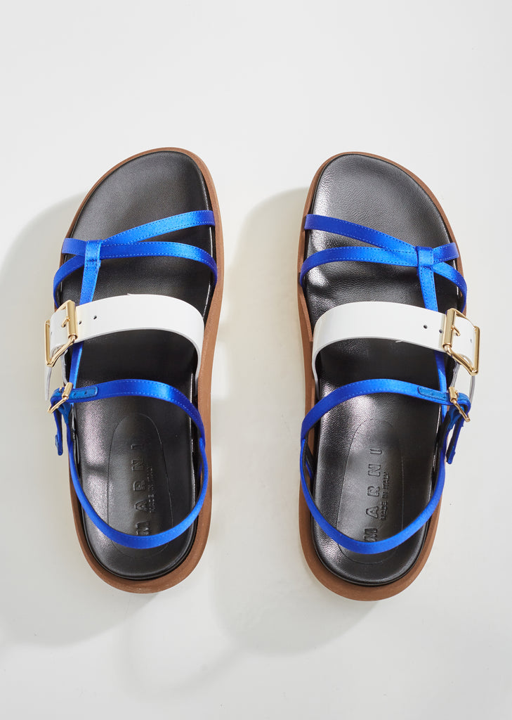New from Marni — Platform sandals with blue satin and white leather straps. Detailed with buckle closures at the ankle. Platform measures 2" approximately. Color: Bluette/Lily White. 100% Leather. Made in Italy.
