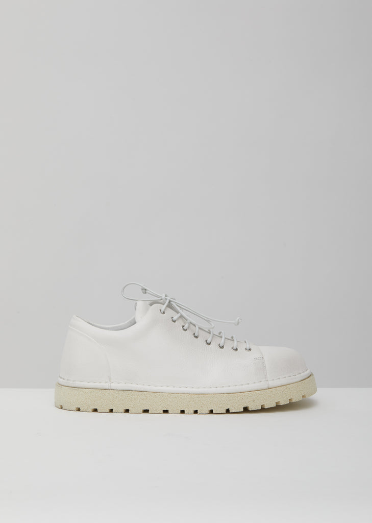 White leather Derby shoe with distressed detailing, a waxed lace-up front fastening, a round toe with tonal stitch detailing and a chunky corrugated rubber sole.