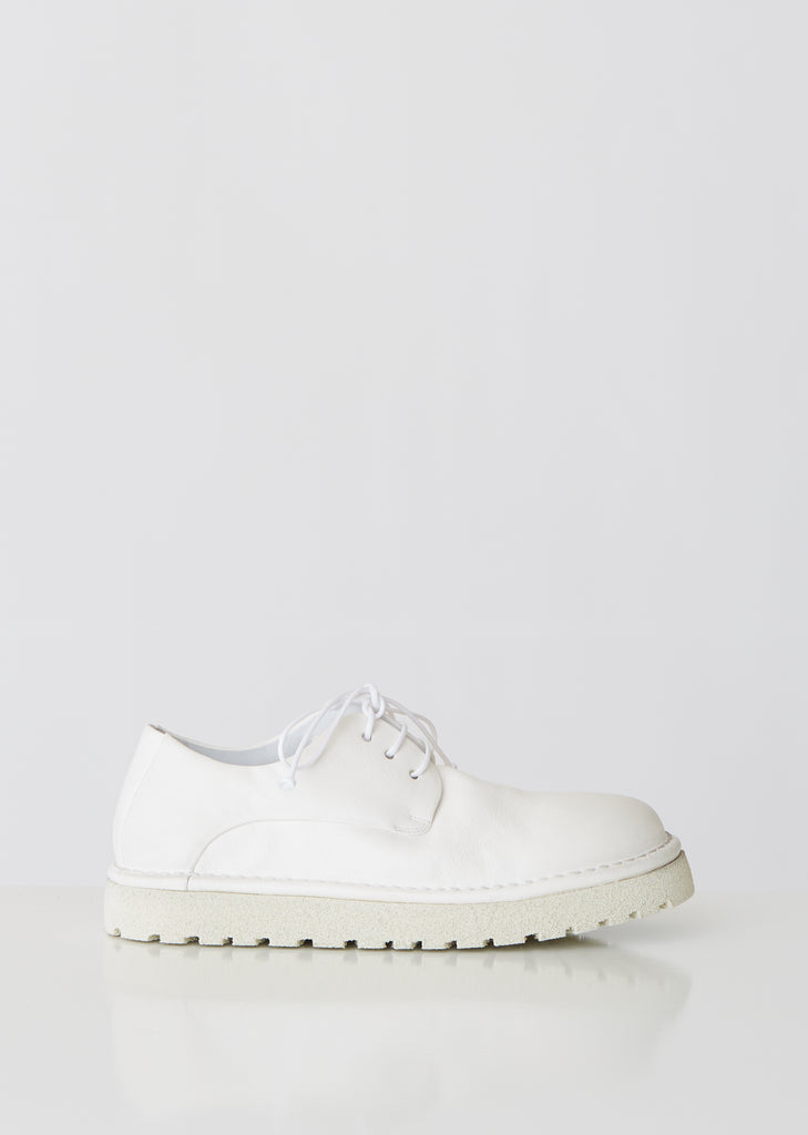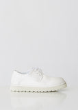 White lace-up derbies in grained leather. Rounded toes and white laces. White stitching along the midsoles. Flat leather tongue. Finished with slightly elevated textural treaded soles. 1" Soles. Color: Vacch Volonata Bianco Optical. 100% Leather; Sole: 100% Rubber. Made in Italy.