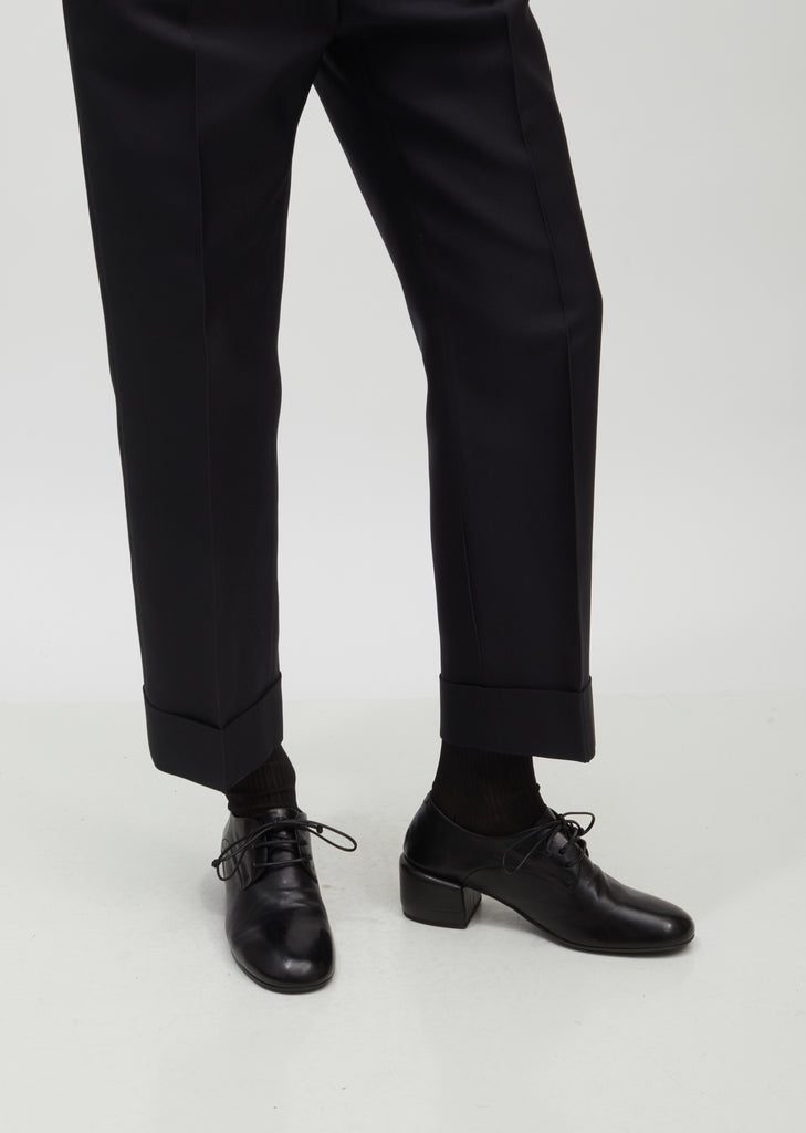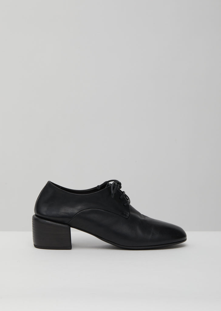 Black calfskin Oxford shoes that fasten at the front with tonal waxed laces, a block heel that measures 2”  and a round toe.