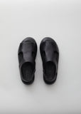 Black calfskin sandals with cutouts at the toe and sides, an elasticated insert at the ankle strap, a leather-covered footbed and a 2” platform sole with rounded sides.