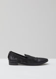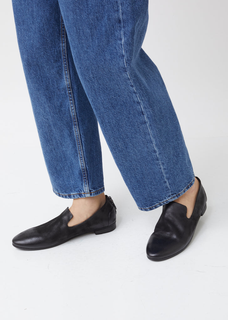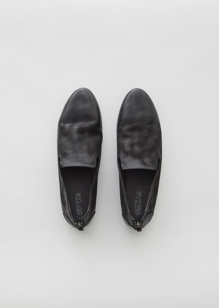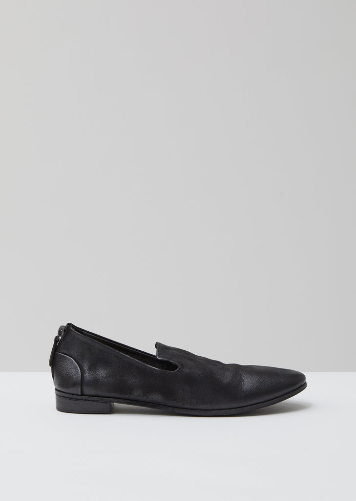 Marsèll's signature ballet-inspired flat in gently distressed black deerskin. Slip-on style. Almond toe. Split heel cap. Zip closure at heel; tonal leather pull and silver-tone metal hardware. Tonal leather midsole. Low stack heel. Tonal leather footbed with debossed logo. Leather lining.