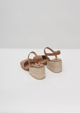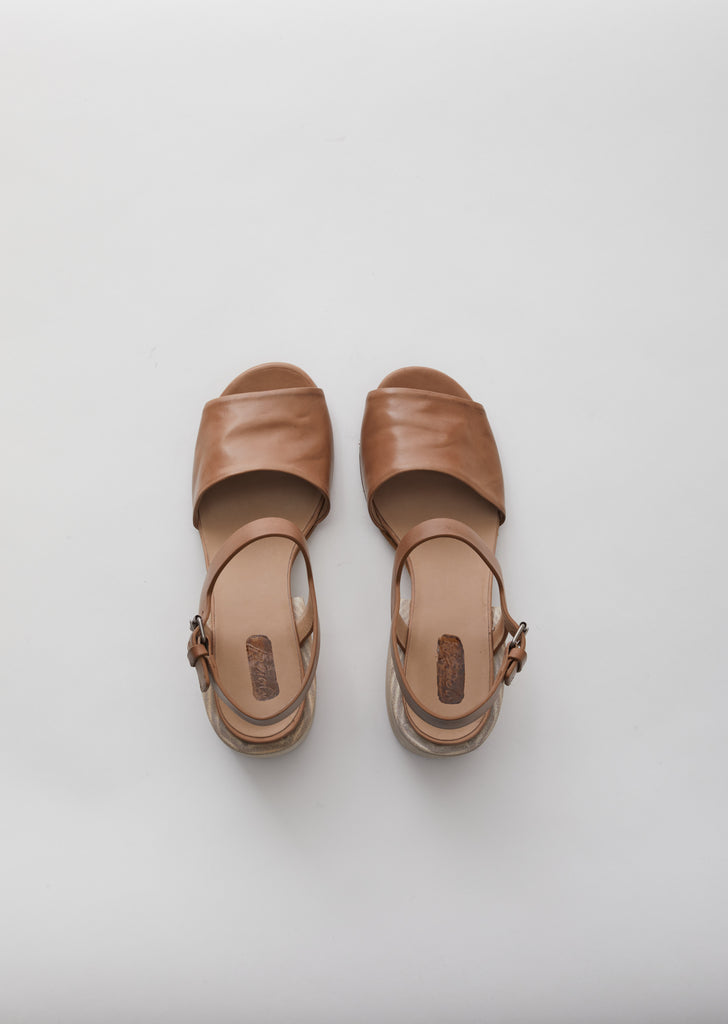 Nut brown calfskin sandals with a wide toe strap, a buckled ankle strap, a leather-covered footbed and a wooden block heel that measures 3".
