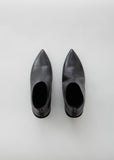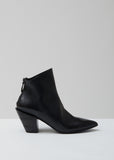 Semi-matte black calfskin ankle boot finished with a pointed toe and a tonal leather mid stack heel. Angled collar and stack heel. Exposed gunmetal-tone back zip with tonal leather pull. Tonal leather insole, midsole, and outsole. Debossed logo at footbed. Leather lining.