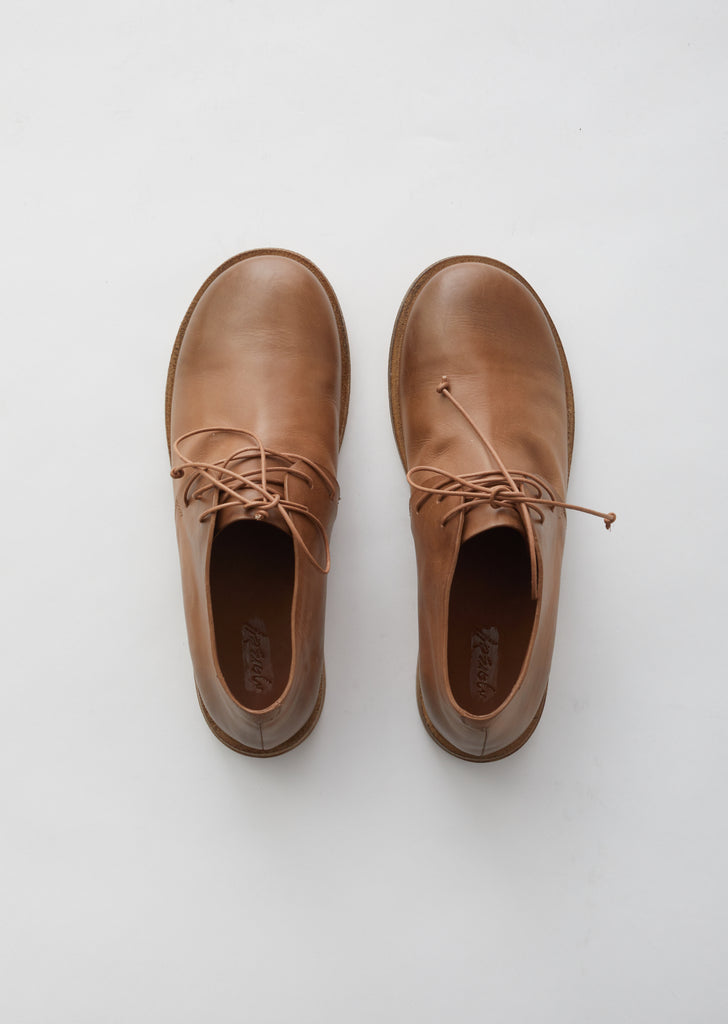 Hazelnut-brown lace-up derbies crafted of burnished calfskin. Designed with a round toe and finished with tonal waxed-cotton laces.