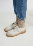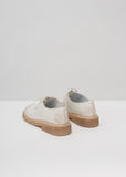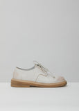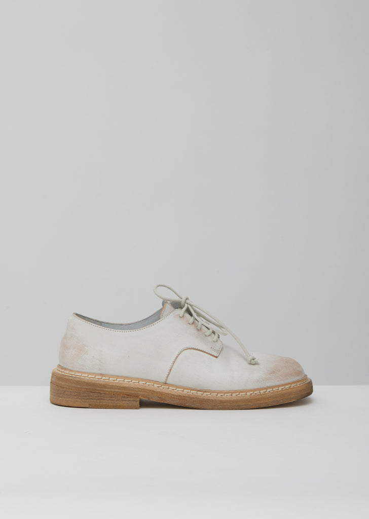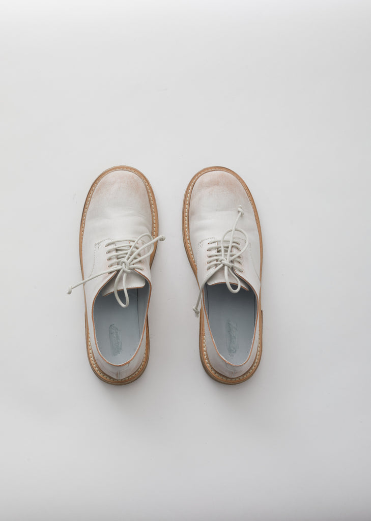 White waxed leather Derby Oxfords with a low stacked heel that measures 1.5”, a front fastening with tonal waxed laces, topstitch detailing at the soles and a round toe.