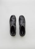 Black calfskin round-toe ankle boots featuring a back zip and a protruding leather block heel. Tonal leather pull at back zip. Gunmetal hardware. Narrow leather midsole. Leather footbed with debossed logo. Leather lining.