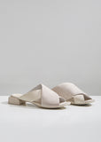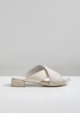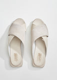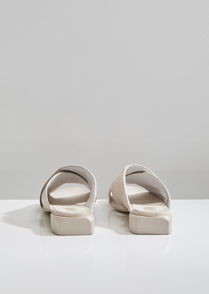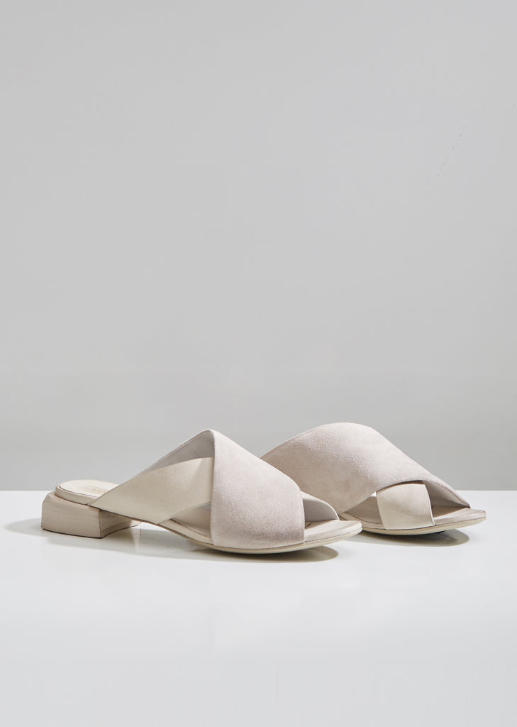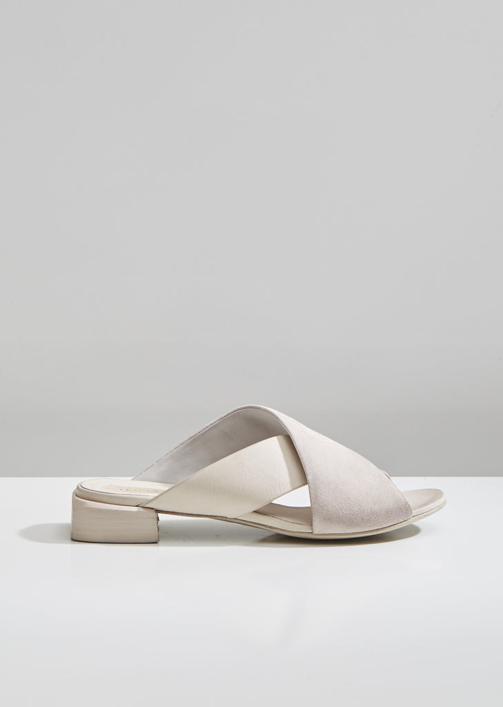 A new sandal from Marsèll: White Stuzzichino sandals with distressed suede and smooth leather crossed straps. Designed with rounded toes and squared stacked heels. Finished with smooth leather lining. Heel height: 1". Color: Caprona Rov Ras Foschia. 100% Leather. Made in Italy.
