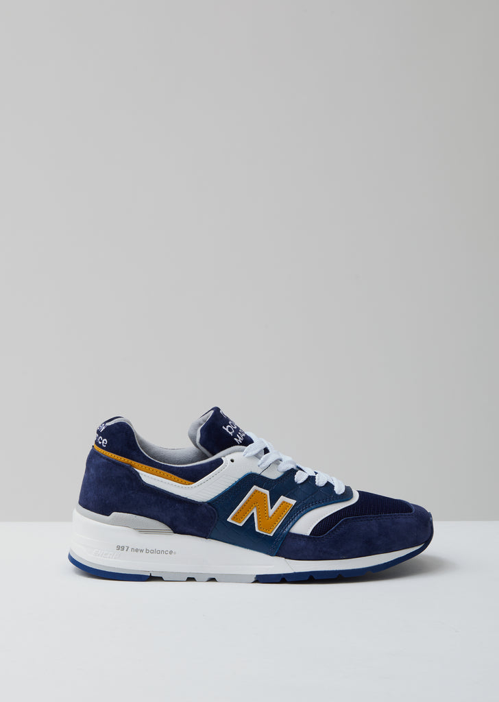 Classic running-sneaker archetype reimagined in blue, white, and yellow pigskin and mesh. Round toe. Open lacing system; flat white woven laces. Suede, leather, and mesh upper in white and several tones of blue. Padded tongue and collar. Logo embroidery at tongue. ENCAP midsole technology provides support. EVA foam midsole provides cushioning. White rubber outsole.