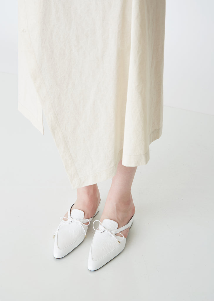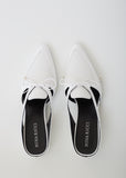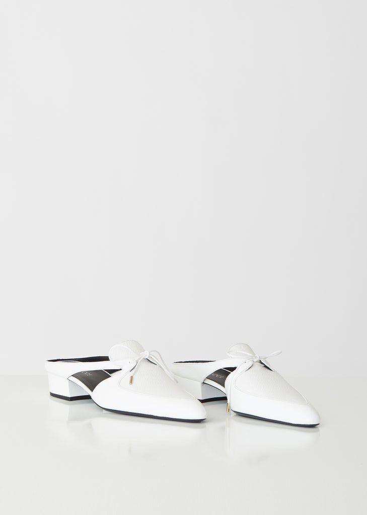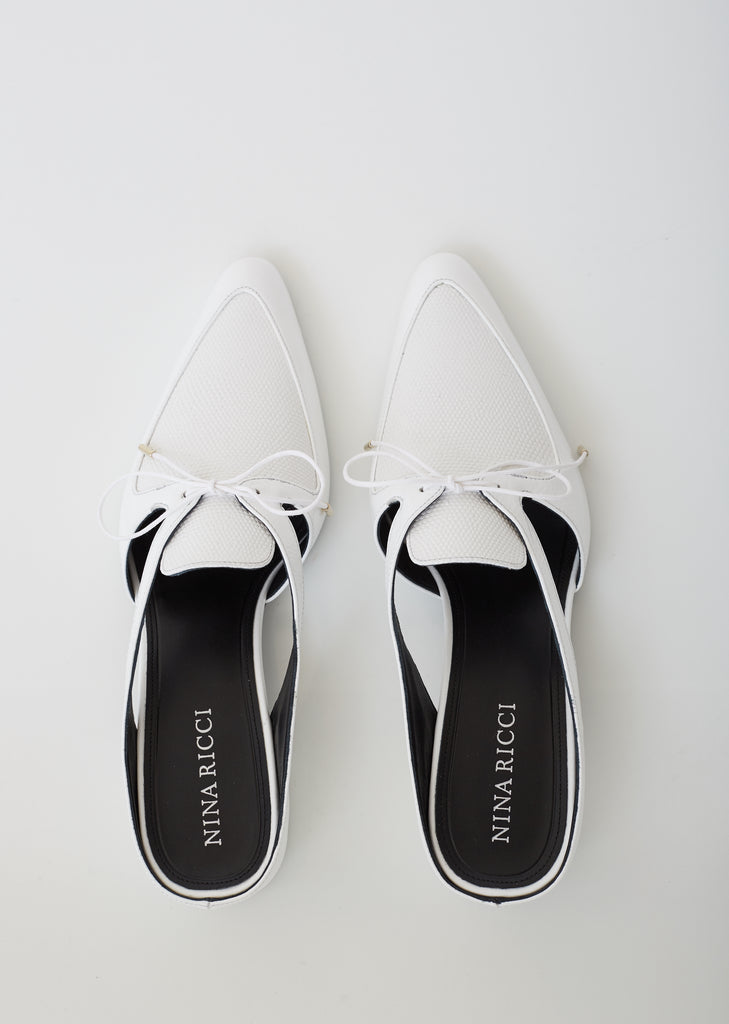 New from Nina Ricci: Pointed toe pumps in glossy and snakeskin-stamped lamb leather. Made in Italy and detailed with white ties at the tops with silver hardware. Polished slip-on style with black leather soles. Low stacked heel. Heel height: 1". Color: 100% Lamb Leather. Made in Italy.