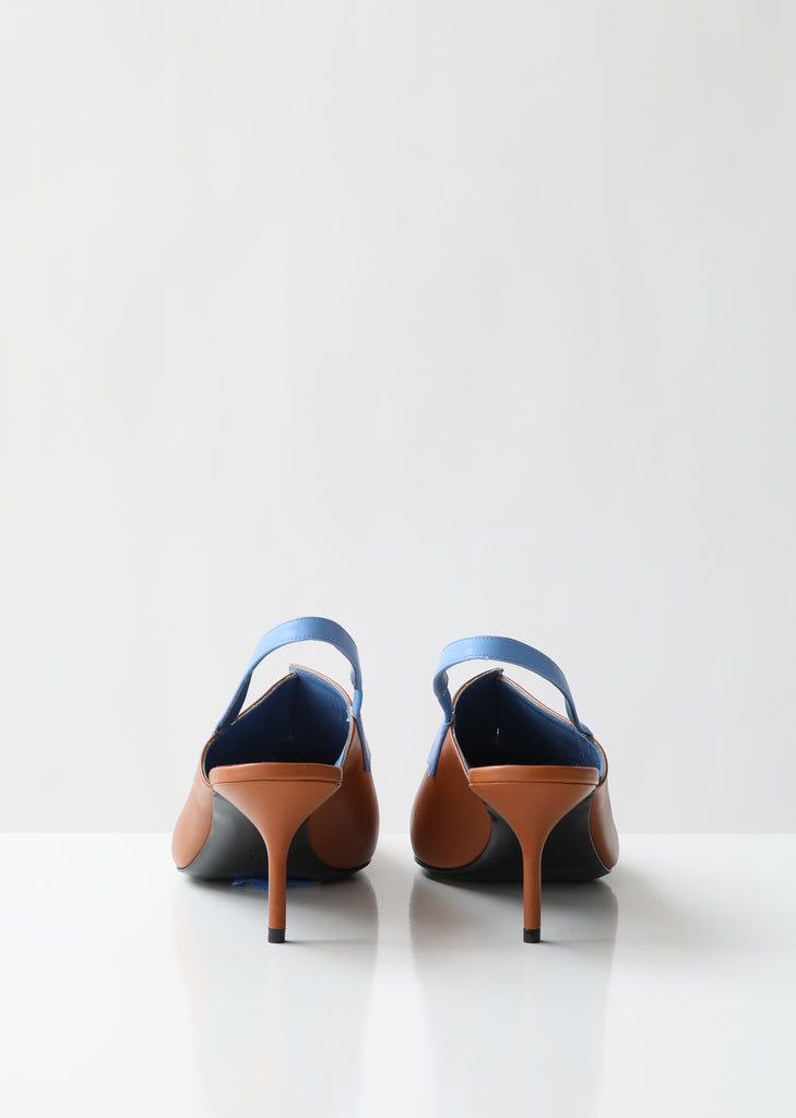 Minimalist heels in camel calf leather, with contrasting blue slingback straps for a modern take on the mule. Pointed toes with clean v-shaped cuts at the seam. Sleek kitten heels. Blue and black leather lining. Black leather soles. 2" heel. Color: Calf-lamb Camel-light Blue. Made in Italy.