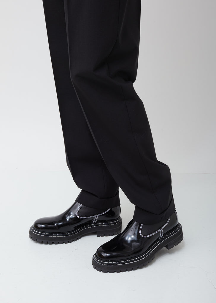 Black lugged-sole Chelsea boots in a polished spazzolato lambskin. Slip-on style. Contrast canvas pull tabs at sides. Round toe. Tonal fabric shaft. Contrast topstitching at welt and shaft. Calfskin-and-goatskin lining. 10mm heel.